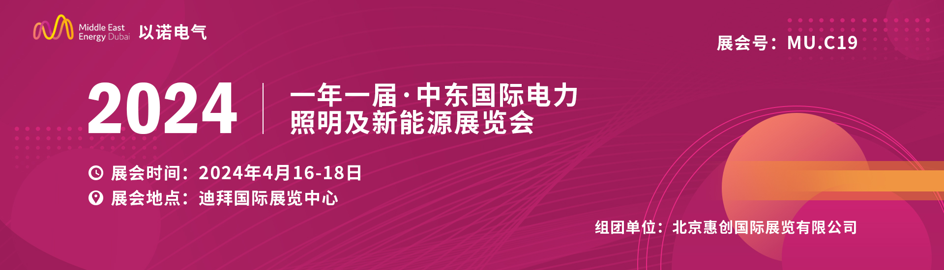 展会时间:2024年4月16--18日 展会号:MU.C19展会地点:迪拜国际展览中心举办周期:一年一届 组团单位:北京惠创国际展览有限公司 展会介绍 “中东国际电力、照明及新能源展览会”(简